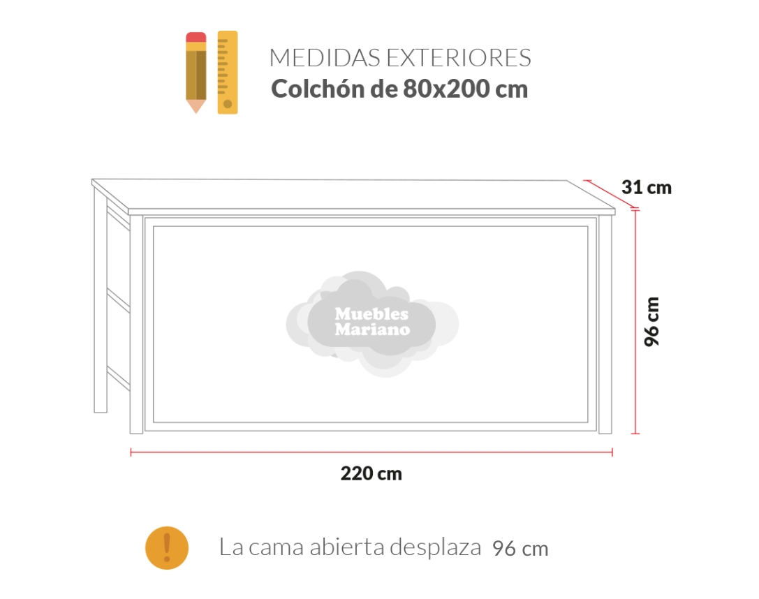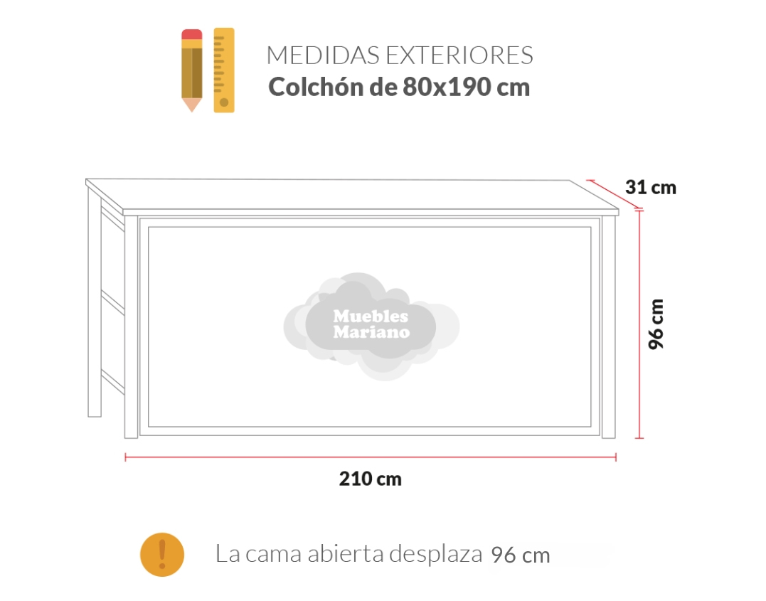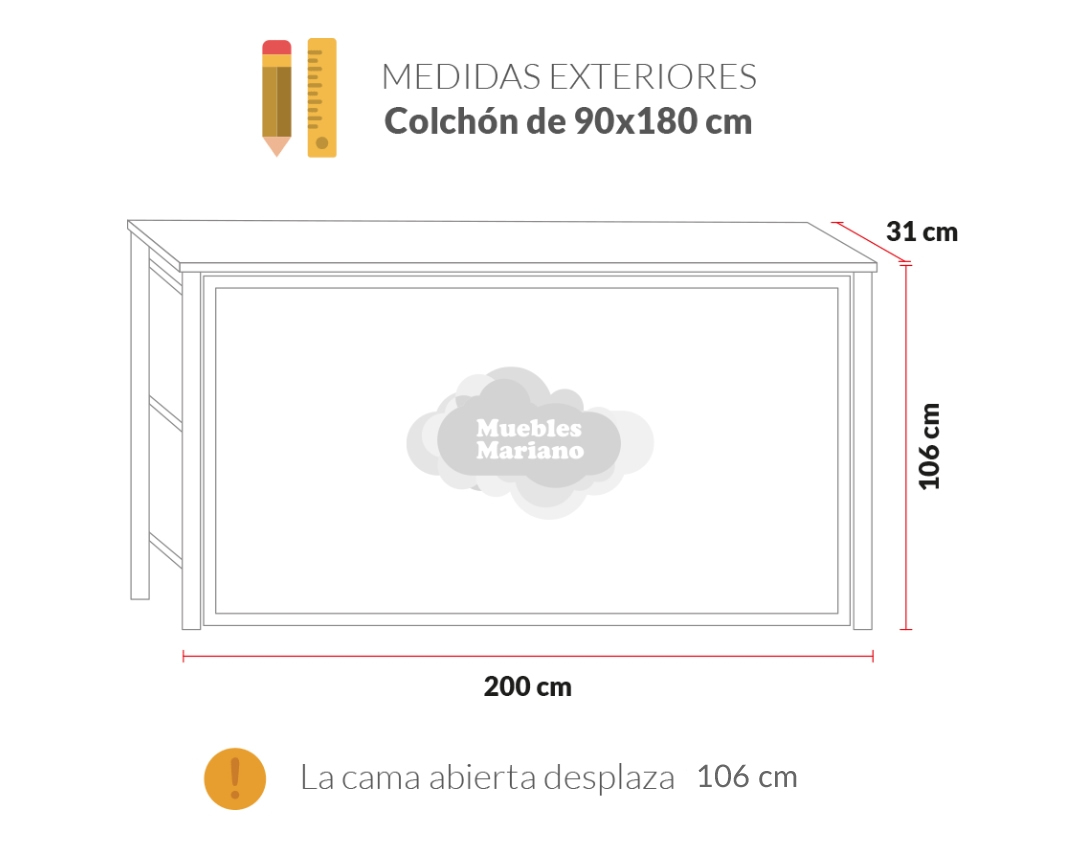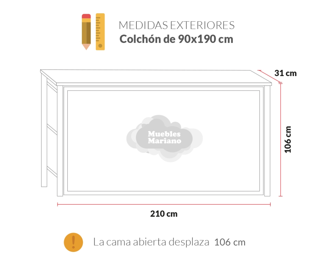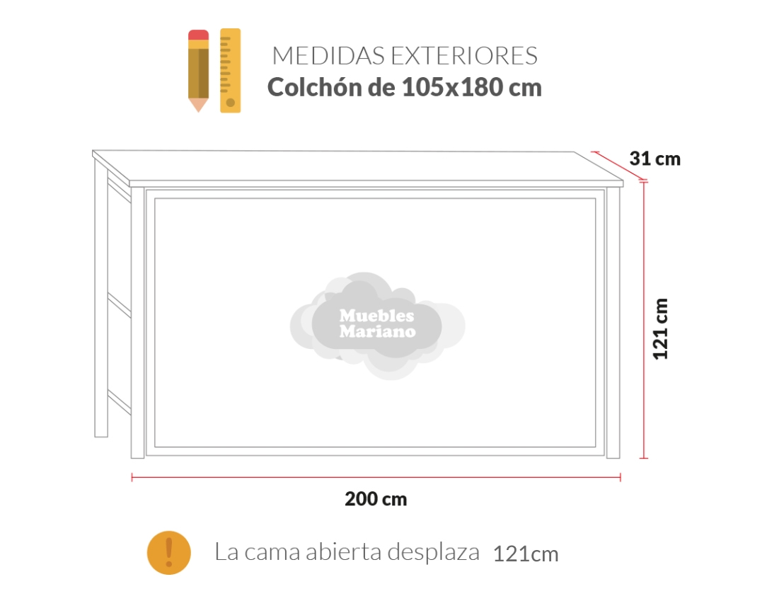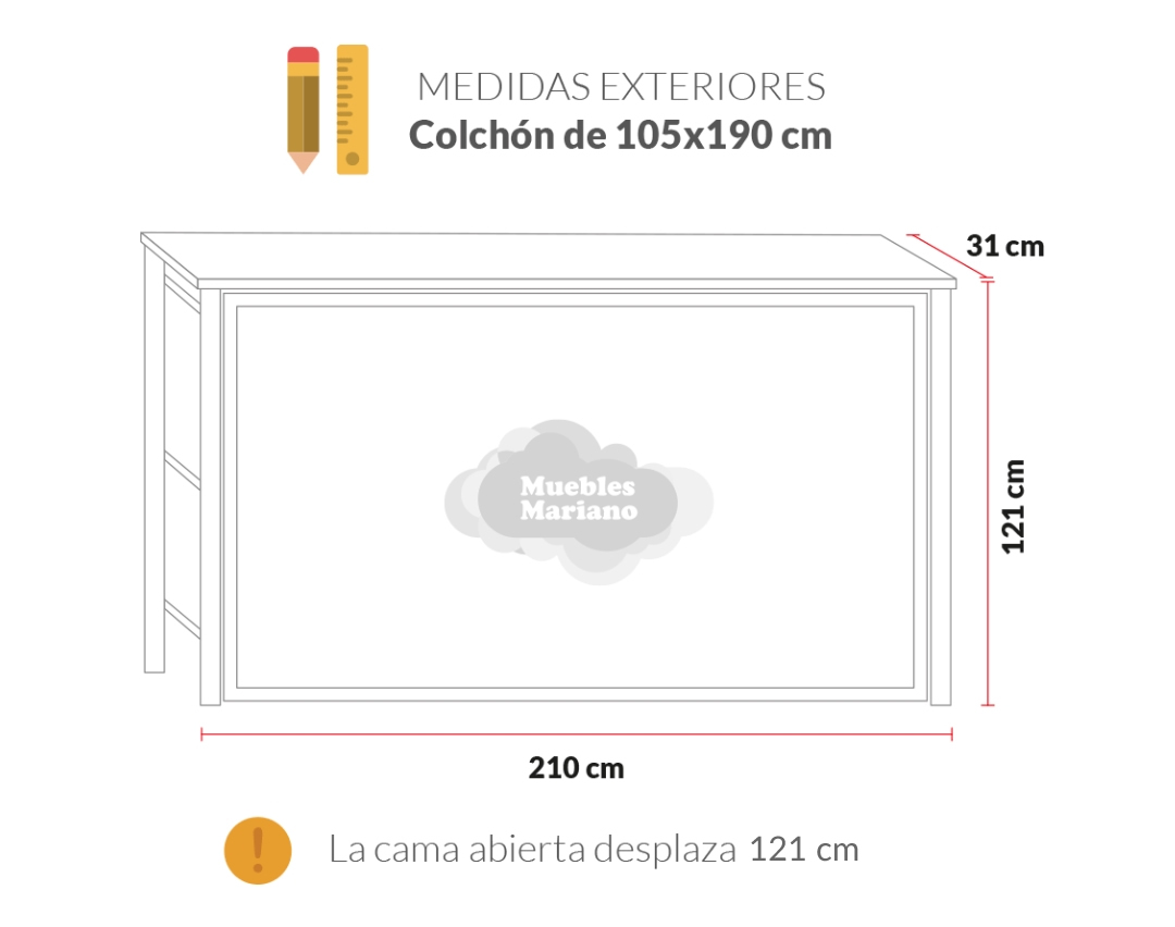 Cama abatible horizontal para una persona con sistema de apertura con amortiguadores que facilitan la apertura y cierre de la cama. La estructura metálica dispone de topes donde descansa el somier y patas escamoteables. La estructura de la cama abatible metálica se atornilla a la pared, convirtiéndola así, en una de las camas abatibles más fuertes y robustas del mercado.