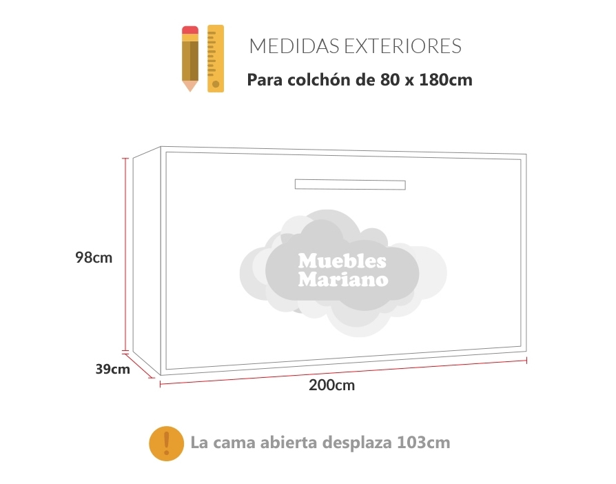 Cama abatible horizontal de matrimonio con librería y acabado en DM (Densidad Media) lacado con 3 capas. Sistema de apertura con amortiguadores hidráulicos que facilitan la apertura y cierre de la cama. Para abrir esta cama abatible de matrimonio, simplemente tienes que tirar un poco del tirador y la cama baja “sola”, sin necesidad de sacar las patas, pues salen automáticamente según va bajando la cama, quedándose bloqueadas una vez la cama esta completamente abierta..