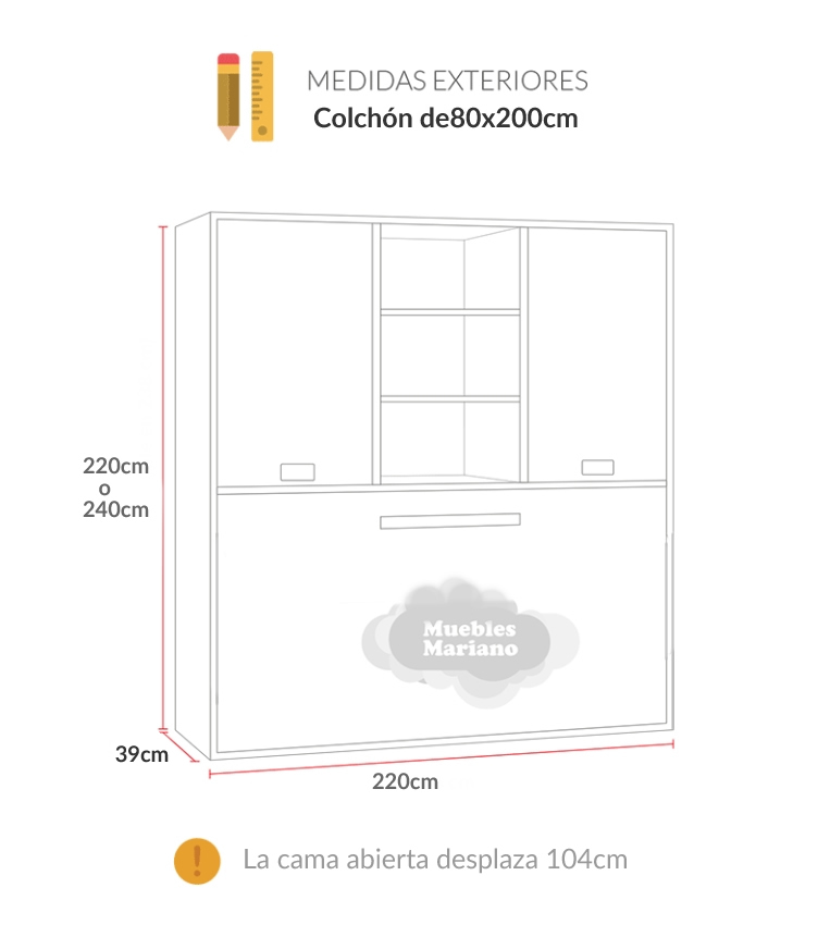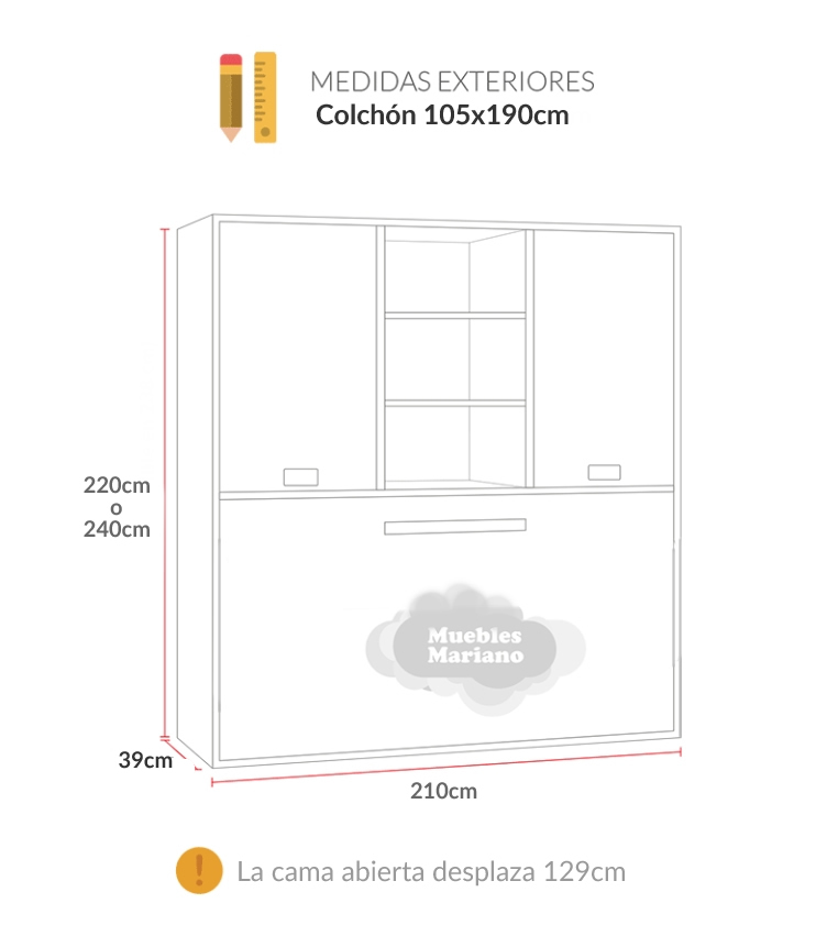 Cama abatible horizontal individual con puertas y librería, acabado en DM (Densidad Media) lacado con 3 capas. Sistema de apertura con amortiguadores hidráulicos que facilitan la apertura y cierre de la cama. Para abrir esta cama abatible de matrimonio, simplemente tienes que tirar un poco del tirador y la cama baja “sola”, sin necesidad de sacar las patas, pues salen automáticamente según va bajando la cama, quedándose bloqueadas una vez la cama está completamente abierta