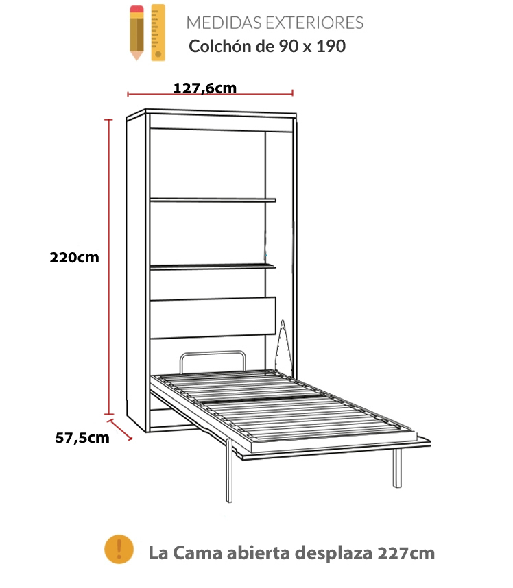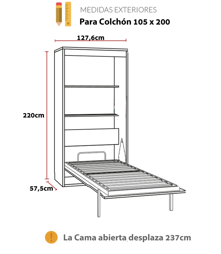 Cama abatible vertical individual con estantes interiores. patas sistema automático por gravedad y regulables en altura. Amortiguador hidráulico con sistema de retención.
