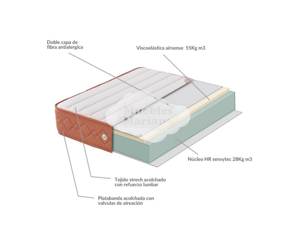 Colchón de Núcleo HR y Visco Bloque interior de alta densidad 28Kg m3. Firmeza media, buena adaptabilidad. 2 años de garantía