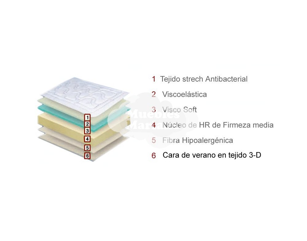 Colchón de Núcleo HR y Visco Bloque interior de alta densidad 28Kg m3. Firmeza media, buena adaptabilidad. 2 años de garantía