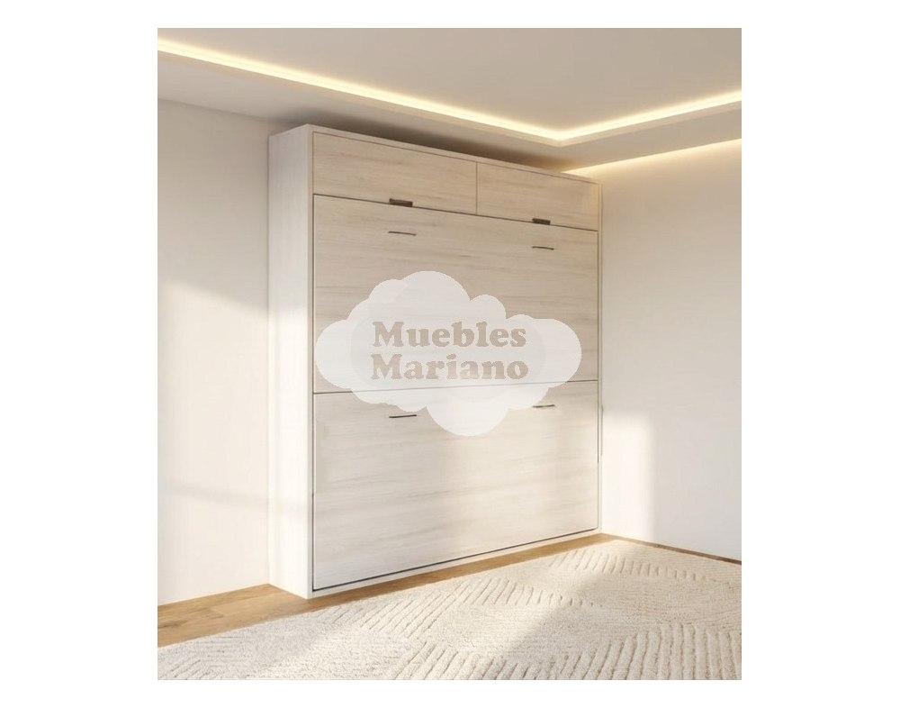 Litera abatible horizontal con 2 camas individuales. Dispone de un sistema de apertura con amortiguadores hidráulicos que facilitan la apertura y cierre de la litera abatible. En la cama baja las patas son regulables con apertura por gravedad. Amortiguador hidráulico con sistema de retención.